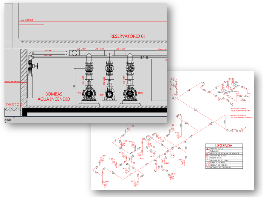 - Sistemas de Combate e Supressão: Dimensionamento de redes de hidrantes, mangotinhos e sprinklers, garantindo a pressão e o volume de água necessários para o controle efetivo de focos de incêndio.