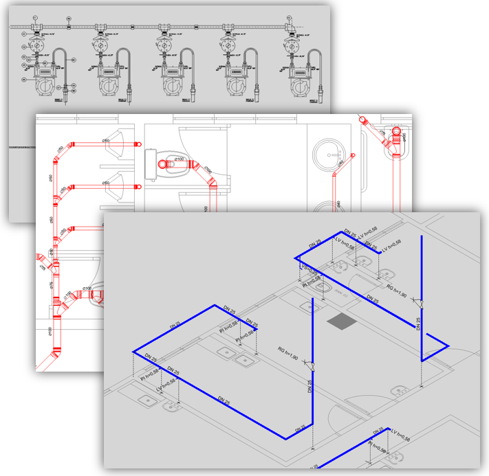 - Sistemas de água fria e água quente, incluindo dimensionamento de tubulações, reservatórios, aquecimento e distribuição.